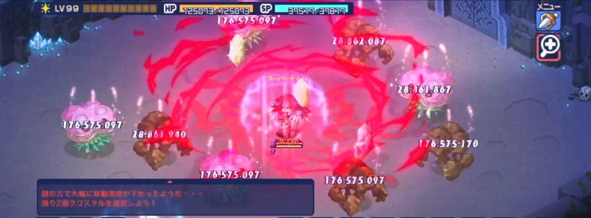 正確な距離測定のしかたを知らないのですがこんだけ広い範囲当たるならほぼフェイと同じかなと思ってます。ちなみに下のGIFは40レベルティノでライム装備ありの火力です!ほら、60レベルM10のゴリゴリ召喚装備ばっかりだと参考にならないのでね、うん。。。
