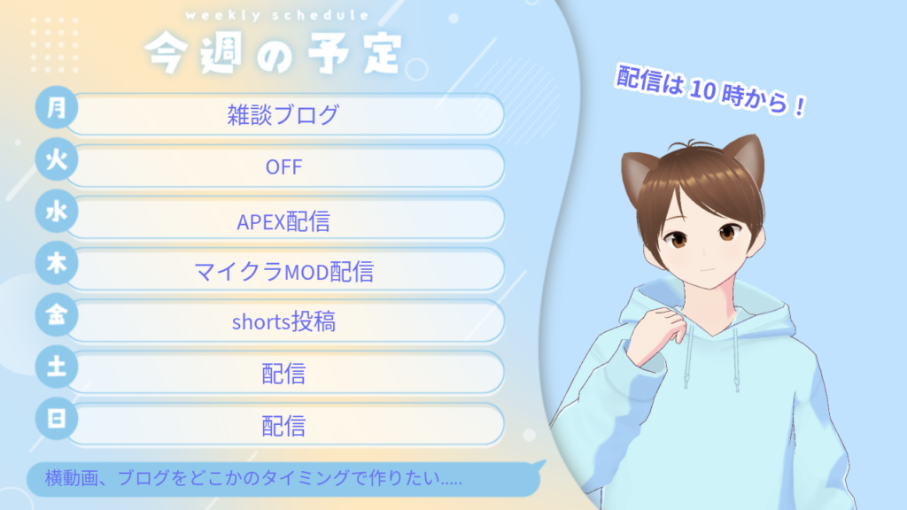 こんな感じで今週もやっていきます!おそらくほぼこの予定でこれからもやってくと思いますので、ぜひ配信や動画も見に来てください!