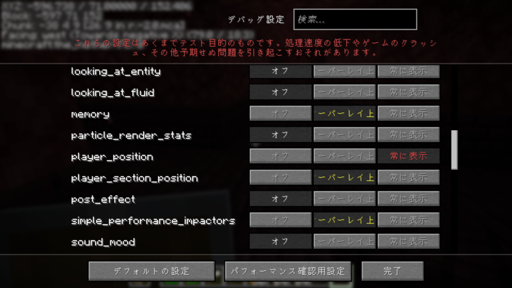 1.21.9以降のバージョンはデバック機能をカスタマイズでき、F3+F6を同時押しすることで下のような画面が表示され、player_positionを常に表示にすることで座標が左上に表示されます!